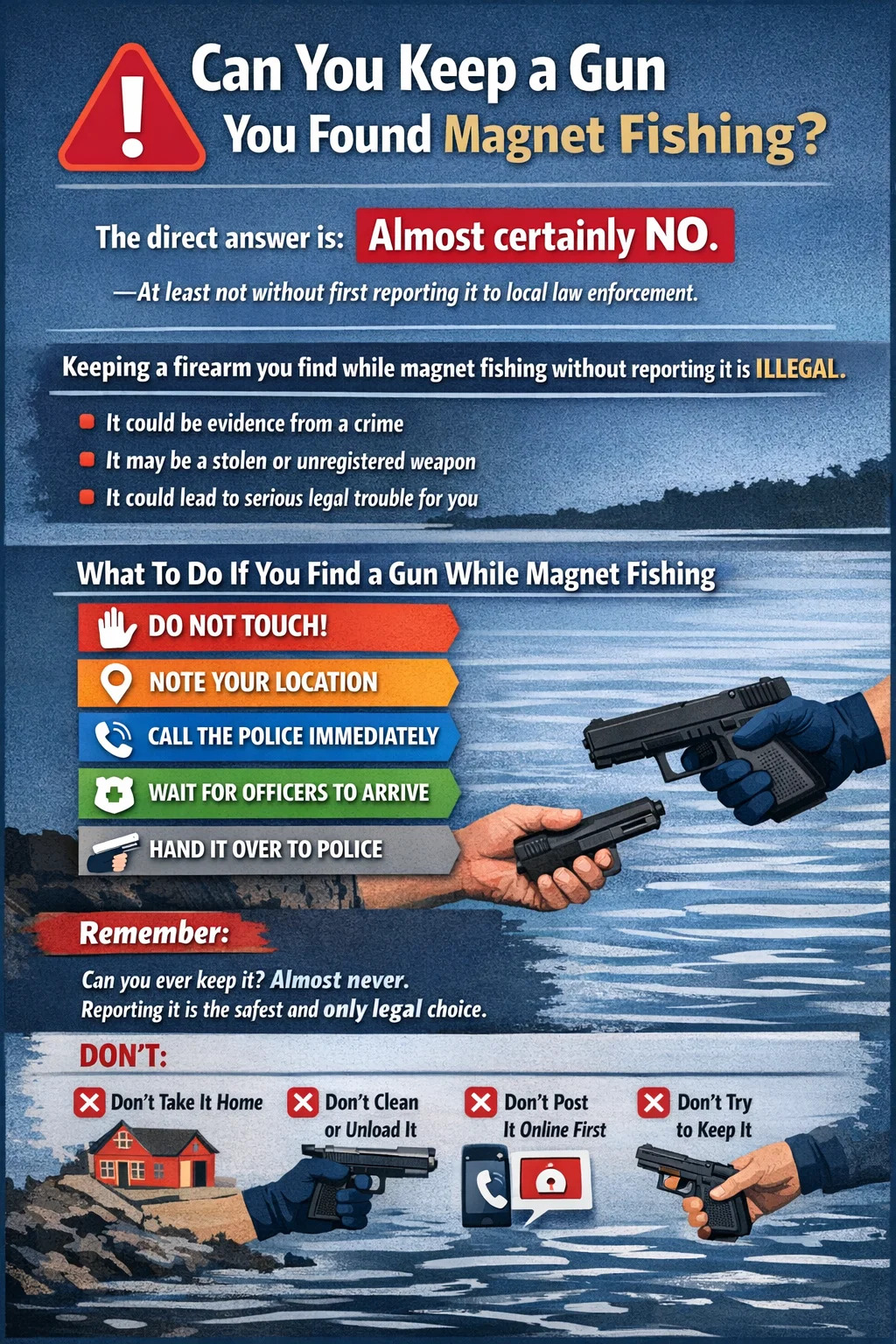 Det korta svaret är: nästan säkert nej - åtminstone inte utan att först rapportera det till lokala brottsbekämpande myndigheter. I de flesta amerikanska stater, såväl som i Storbritannien, Kanada och Australien, är det olagligt att hålla ett skjutvapen som du dragit upp ur vattnet med en fiskemagnet utan att rapportera det. Vapnet kan vara bevis för ett brott, rapporterat stulet eller ett oregistrerat vapen - vilket som helst skapar allvarlig juridisk exponering för dig i det ögonblick du bestämmer dig för att gå därifrån.