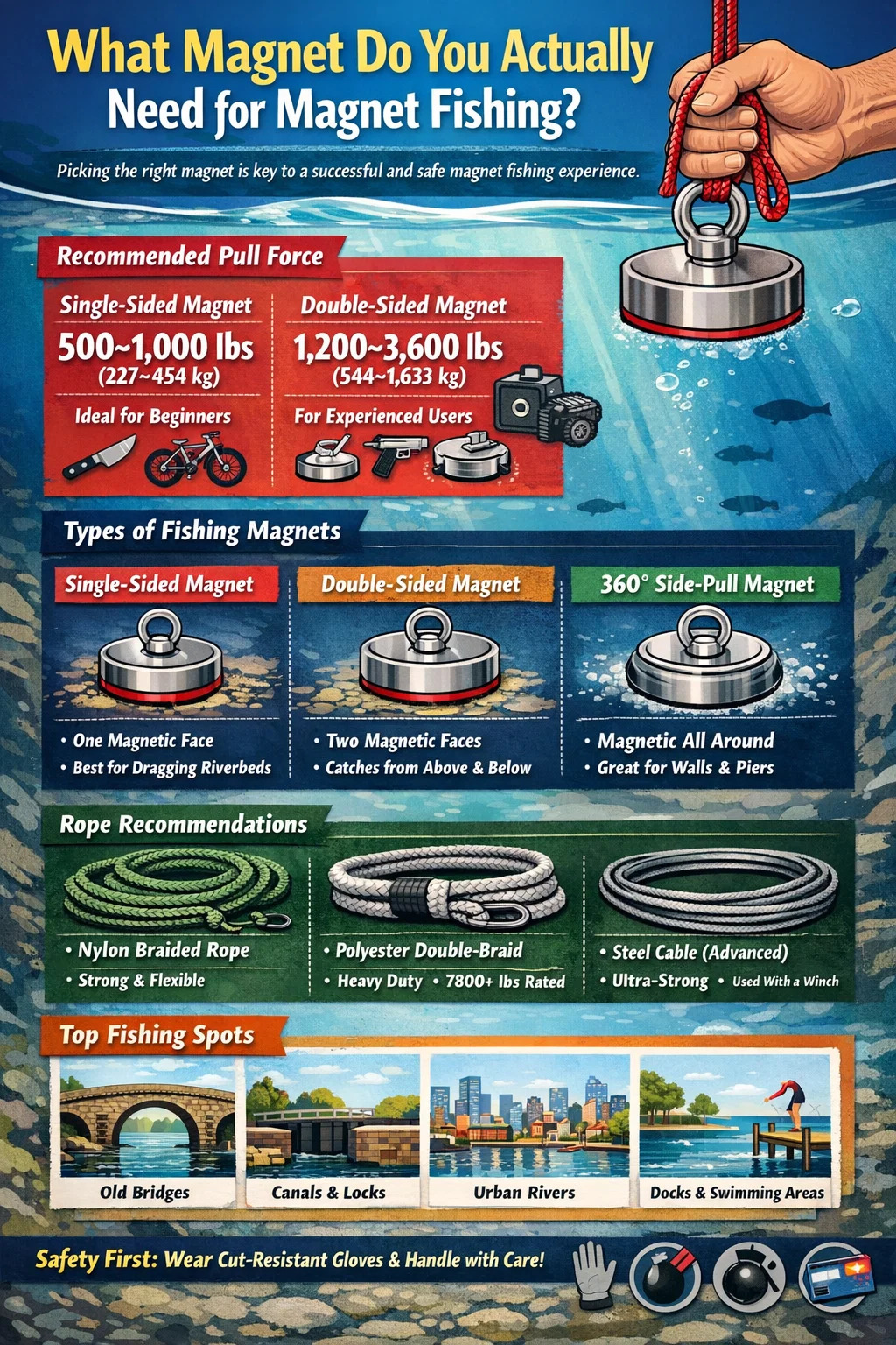 Det korta svaret: för de flesta nybörjare, a enkelsidig neodymmagnet med 500–1 000 lbs (227–454 kg) dragkraft är den idealiska utgångspunkten för magnetfiske. Den är tillräckligt stark för att hämta knivar, verktyg, cyklar och till och med kassaskåp från floder och sjöar, men ändå hanterbar nog att hantera säkert utan specialutrustning. Om du är mer erfaren eller riktar in dig på tyngre föremål på djupt vatten, blir en dubbelsidig magnet i intervallet 1 200–3 600 lb det bättre valet.