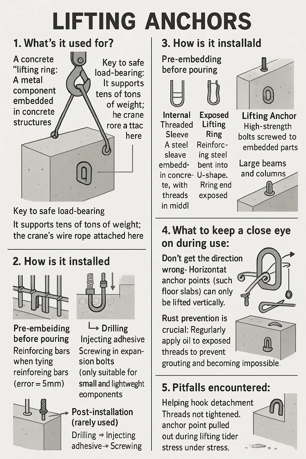 En "lyftring" av betong: En metallkomponent inbäddad i betongkonstruktioner (väggpaneler, trappor, balkar). Krokar eller bultar skruvas direkt på den för lyft.